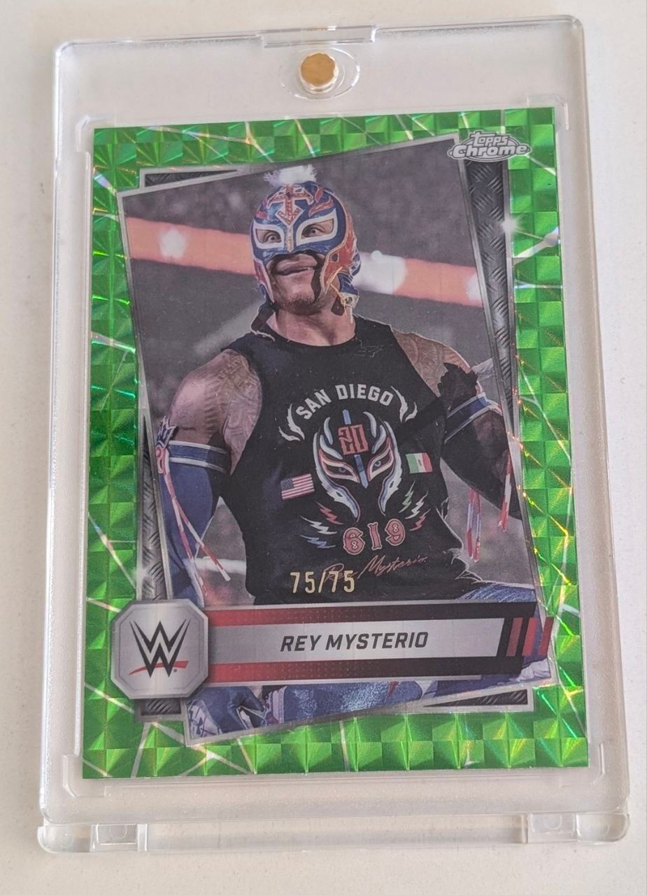 This is a Topps Chrome Green Refractor Rey Mysterio, serial numbered 75/75. A true end-of-print card featuring one of the most iconic luchadors in wrestling history. The green refractor finish pops hard, the imagery is classic Rey, and the numbering makes this a legit collector piece, not just a throw-in.